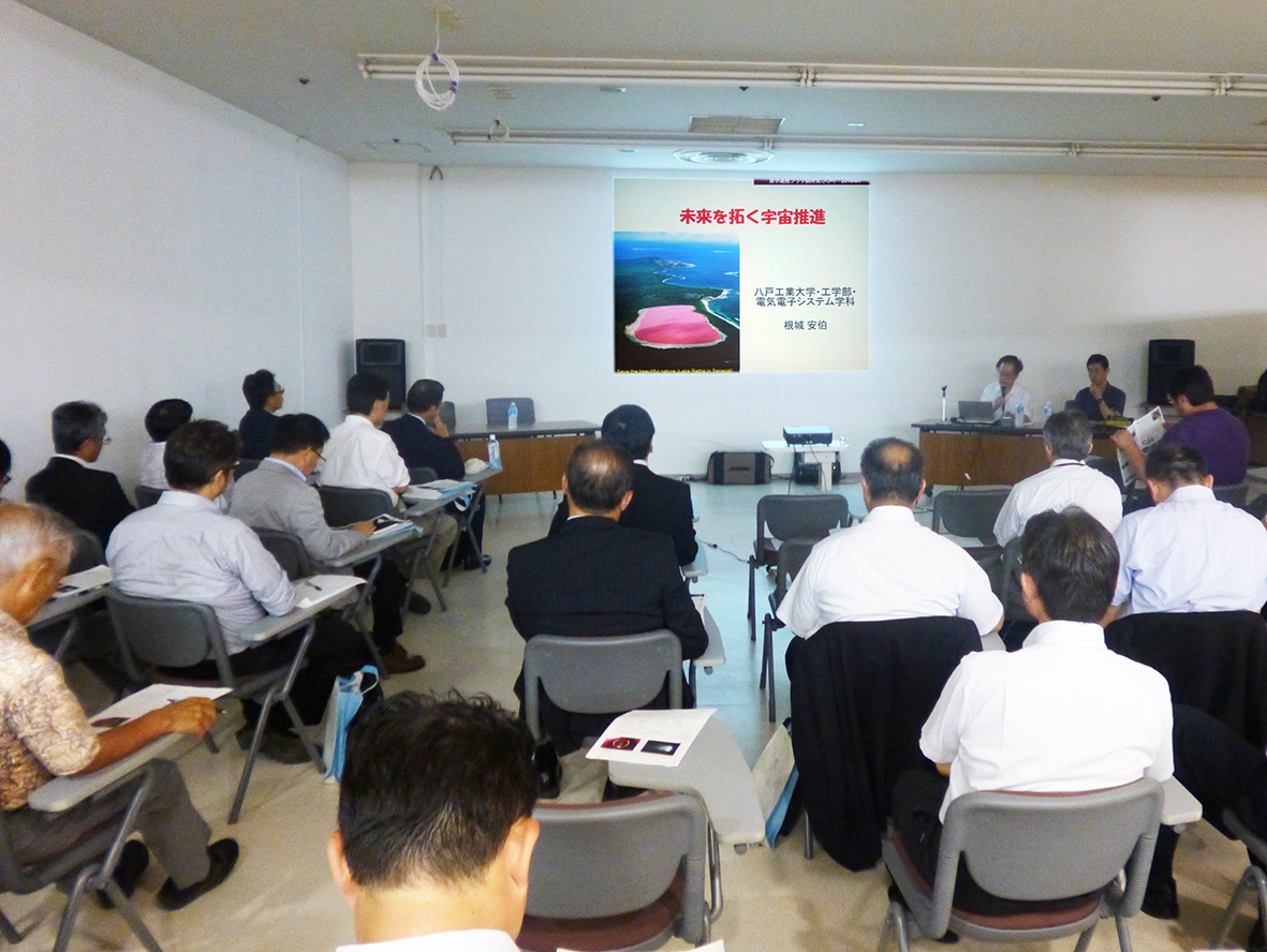 開所記念セミナーでは電気電子システム学科教授の根城安伯から「未来を拓く宇宙推進」と題して講演が行われました。地球への帰還を果たした技術で世界をアッと言わせた宇宙機「はやぶさ」は、我々を感動させました。また、17 日の朝刊では宇宙船の機体に炭素繊維を使用する話題が取り上げられており、可能性が広がる宇宙技術です。宇宙開拓や探査活動を進める上で宇宙推進機の開発と性能向上が不可欠です。根城教授はプラズマについて長年研究されており、日本で開発された新しいタイプの推進機の現状について紹介されました 。
