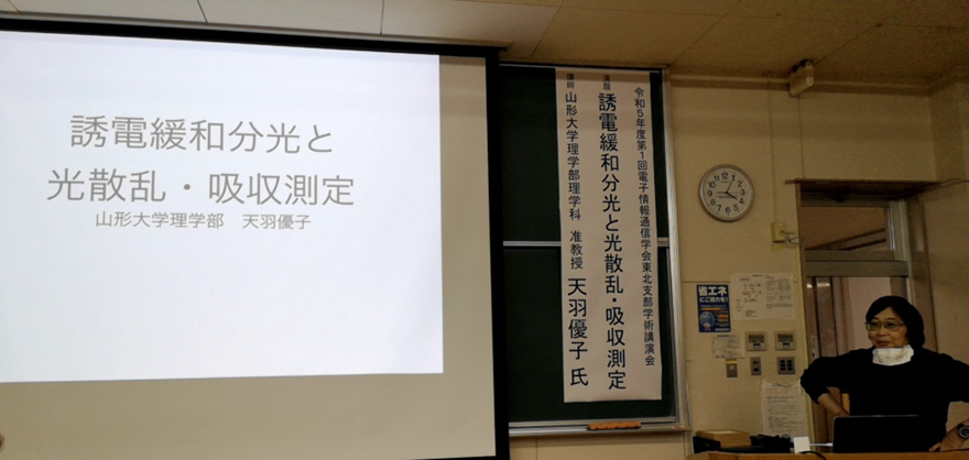 2023年12月8日(金)の16:10 – 17:40は八戸工業大学工学部・電気電子工学科の4-209講義室にて、誘電緩和分光と光散乱・吸収測定と題し、山形大学理学部の天羽優子先生による電子情報通信学会東北支部の講演会が実施されました。電波や光は共に電磁波の一種ですが、天羽先生は現在、空間を伝搬する数100kHzという低い周波数の電波から光領域にかけた広い帯域(波長域)での、電磁波の物質(誘電体)への入射に対する応答(反射や吸収)特性との関係(複素誘電率(屈折率)等の電気定数と関連付ける誘電体という物質と電波や光との相互作用)を解明する先駆的な理論・実験的検討に従事されています。しかし、これらの関係は電波や光の伝搬、反射(散乱)、吸収を司る支配方程式に従います。その為、この日の天羽先生のご講演では先ず、光・電磁波の物理現象を支配する方程式からの反射・散乱・吸収との関係式を導出した上で、電波・光に対する測定結果を考察して頂けました。聴講者には、光の物理現象を液晶ディスプレイへ応用する研究者や、セラミック材料に対して分光計で特性解析をする研究者等、関連する専門家が多く含まれていた為、講演後は活発な質疑応答が行われました。